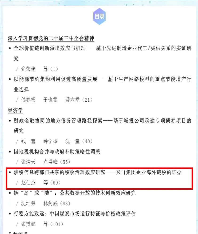近日,冰球官网经济学系赵仁杰教授作为第一作者的论文《涉税信息跨部门共享的税收治理效应研究——来自集团企业海外避税的证据》在顶级期刊《管理世界》2025年第2期发表,该文是赵仁杰老师主持的国家自然科学基金项目、陕西高校青年创新团队、冰球突破豪华版官方网站仲英青年学者项目的阶段性成果。