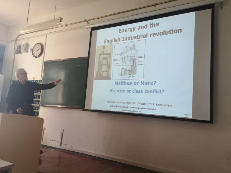 2019年10月29日,挪威国家统计局高级经济师安德森·艾克兰应邀为冰球突破豪华版官方网站2017级经济学(基地班)及2017级数理经济学实验班学生作题为《能源和英国工业革命》的学术报告,报告在2308教室举行,由岳利萍教授主持。在报告中,艾克兰教授以能源的革新为切入点研究第一次英国工业革命,对马尔萨斯和马克思关于工业革命成因的争论展开论述,并从能源的稀缺性和社会阶级矛盾冲突两个角度进行了解释和分析。