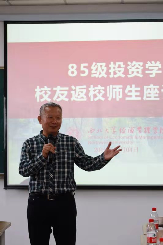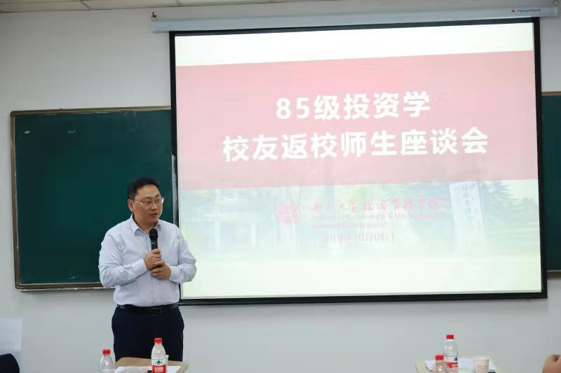当日上午,秋雨绵绵,情思幽长,来自祖国各地的30多位85级投资学校友齐聚他们曾经学习、生活的校园,并在太白校区经管楼408教室举行返校座谈会。校党委常委、副校长王正斌和当年的老师杨德生、师萍、顾颖、徐国营等应邀参加了活动。学院党委书记杜勇、院长吴振磊出席了座谈会。