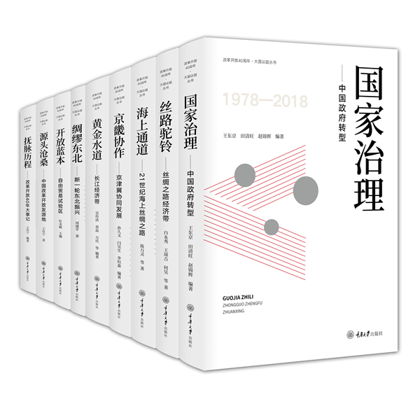 “改革开放40周年·大国议题丛书”以习近平新时代中国特色社会主义思想为指导,选题聚焦党的十八大以来以习近平同志为核心的党中央治国理政的伟大实践,由中央党校(国家行政学院)副校(院)长王东京教授、重庆大学校长张宗益教授担任丛书编委会主任,作者来自中央党校、国家发展改革委、中国人民大学、冰球突破豪华版官方网站等单位。该丛书先后入选重庆市出版专项资金资助项目(2017年)、教育部全国高校出版社主题出版项目(2018年)、国家出版基金资助项目(2019),于2018年底正式出版发行。丛书分为9卷,共300万字,各卷分别为《国家治理——中国政府转型》《丝路驼铃——丝绸之路经济带》《海上通道——21世纪海上丝绸之路》《京畿协作——京津冀协同发展》《黄金水道——长江经济带》《绸缪东北——新一轮东北振兴》《开放蓝本——自由贸易试验区》《源头沧桑——中国改革开放发源地》和《抚脉历程——改革开放40年大事记》。其中,《丝路驼铃——丝绸之路经济带》由白永秀教授领衔撰写,该书分八章研究丝绸之路经济带建设中的理论与实践问题,兼具理论系统性和可读性。