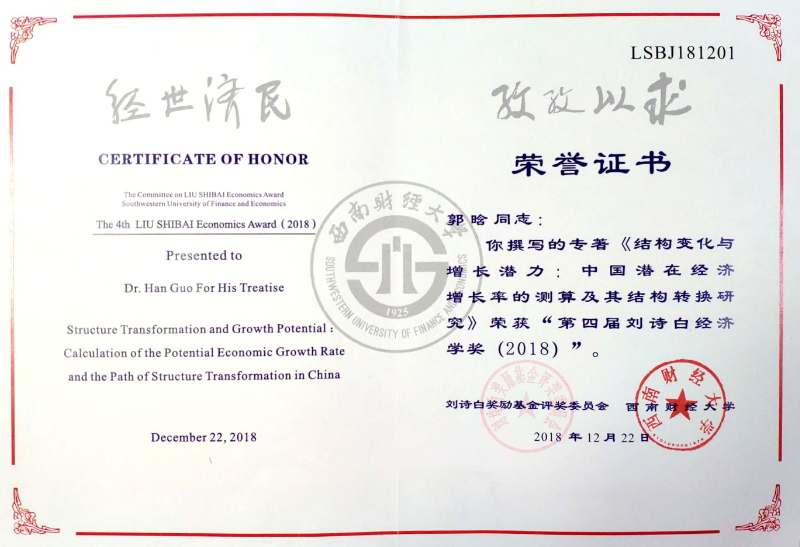 “刘诗白经济学奖”是西南财经大学和刘诗白奖励基金面向全社会设立的经济学奖项,主要奖励国内具有较高理论水平和学术价值,对研究和解决重大现实问题有较强指导意义和应用价值,并获得较好社会反响的经济学研究成果。六年来,刘诗白经济学奖始终秉持推动哲学社会科学繁荣发展,推进中国特色、中国风格、中国气派经济学研究的评奖宗旨,坚持创新和质量的评价导向,贯彻开放、公开、公平的评奖原则,不断加大对研究解决中国重大理论和现实问题的经济学精品力作和优秀青年学者的奖励与推介力度,学术声誉和学术影响力显著提升,在经济学界产生了重大影响。第四届“刘诗白经济学奖”评奖委员会由卫兴华等30位著名经济学家组成,洪银兴任评奖委员会主任,刘诗白任名誉主任。本次获奖成果共有10项,郭晗副教授的专著是其中1项。
