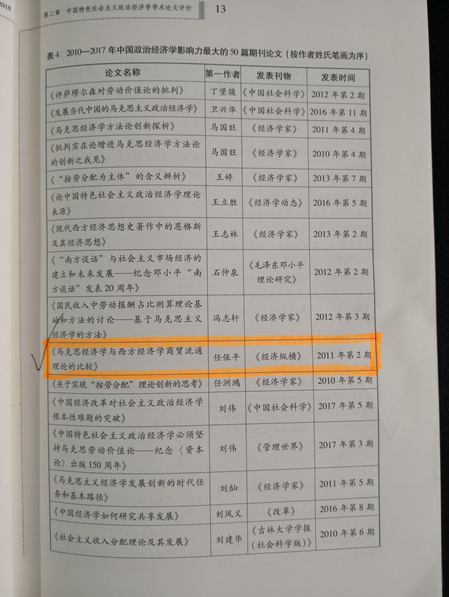 该报告根据中国知网提供的期刊复合影响因子数据,结合文献被引用次数、下载次数等指标以及科学指标权重,计算“中国特色社会主义政治经济学”学术论文影响力。冰球官网任保平教授发表于《经济纵横》2011年第2期的学术论文“马克思主义经济学与西方经济学商贸流通理论的比较”,入选2010-2017年“中国特色社会主义政治经济学”影响力最大的50篇期刊论文。