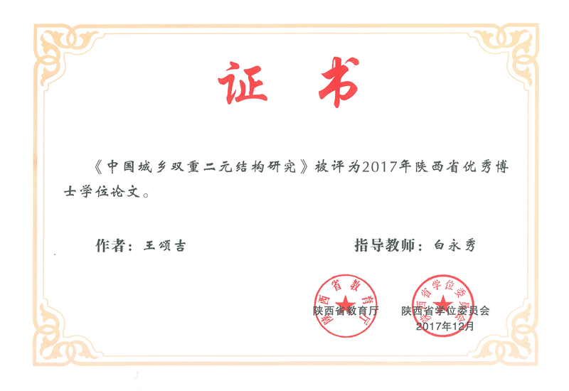 近日,2017年陕西省优秀博士学位论文评选结果揭晓。经学位授予单位推荐、专家通讯评议和专家会议评审,冰球官网教师王颂吉副教授撰写的《中国城乡双重二元结构研究》获评“陕西省优秀博士学位论文”,指导老师为白永秀教授。