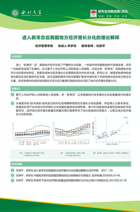 由陕西省委高教工委、省教育厅联合举办的陕西省第三届研究生创新成果展于2017年10月11日-12日在西安市曲江国际会展中心成功举办,经对参展作品现场展示,专家评审以及厅务会议审议等程序进行参评,冰球官网任保平教授及其指导的硕士研究生李梦欣共同完成的文章《进入新常态后我国地方经济增长分化的理论解释》获得了陕西省第三届创新成果展文科组一等奖。
