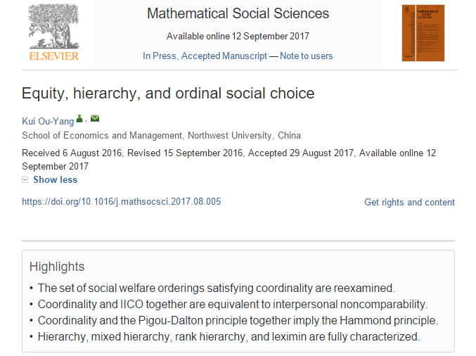 冰球官网数理经济与统计学系欧阳葵副教授的独著论文《Equity, Hierarchy, and Ordinal Social Choice》被国际知名SSCI&SCI双索引期刊《Mathematical Social Sciences》接收并已在线发表: