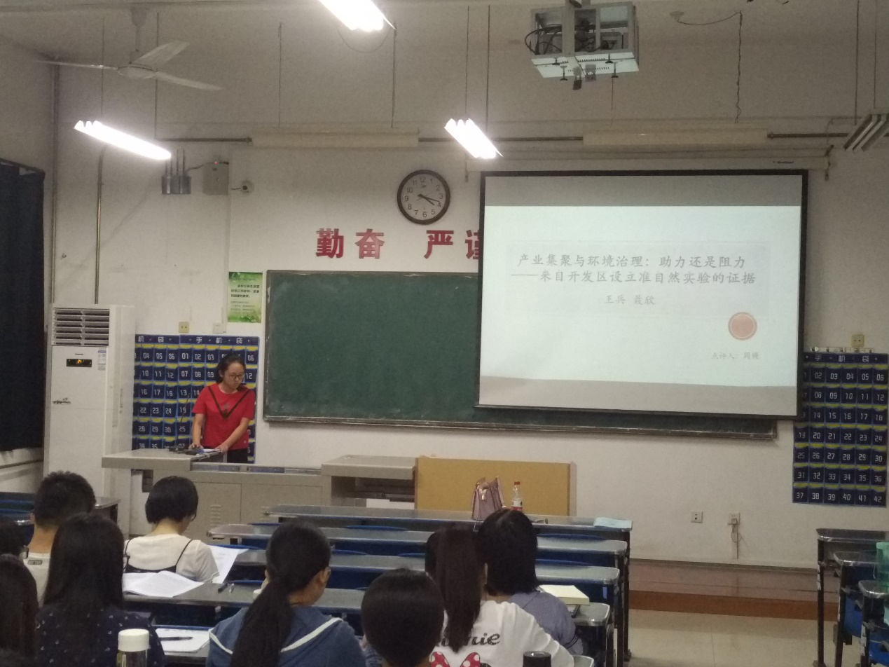 “基地学术课堂”的第二单元为文献研习,2015级经济学基地班本科生王维汀讲解了《产业集聚与环境治理:助力还是阻力——来自开发区设立准自然实验的证据》,2016级经济学基地班本科生周嫚担任评论。