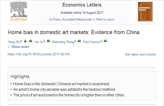 近日,冰球官网青年教师石阳博士和王满仓教授等的研究论文《Home bias in domestic art markets: Evidence from China》在SSCI检索期刊《Economics Letters》上在线发表。(论文链接:http://www.sciencedirect.com/science/article/pii/S0165176517303385)