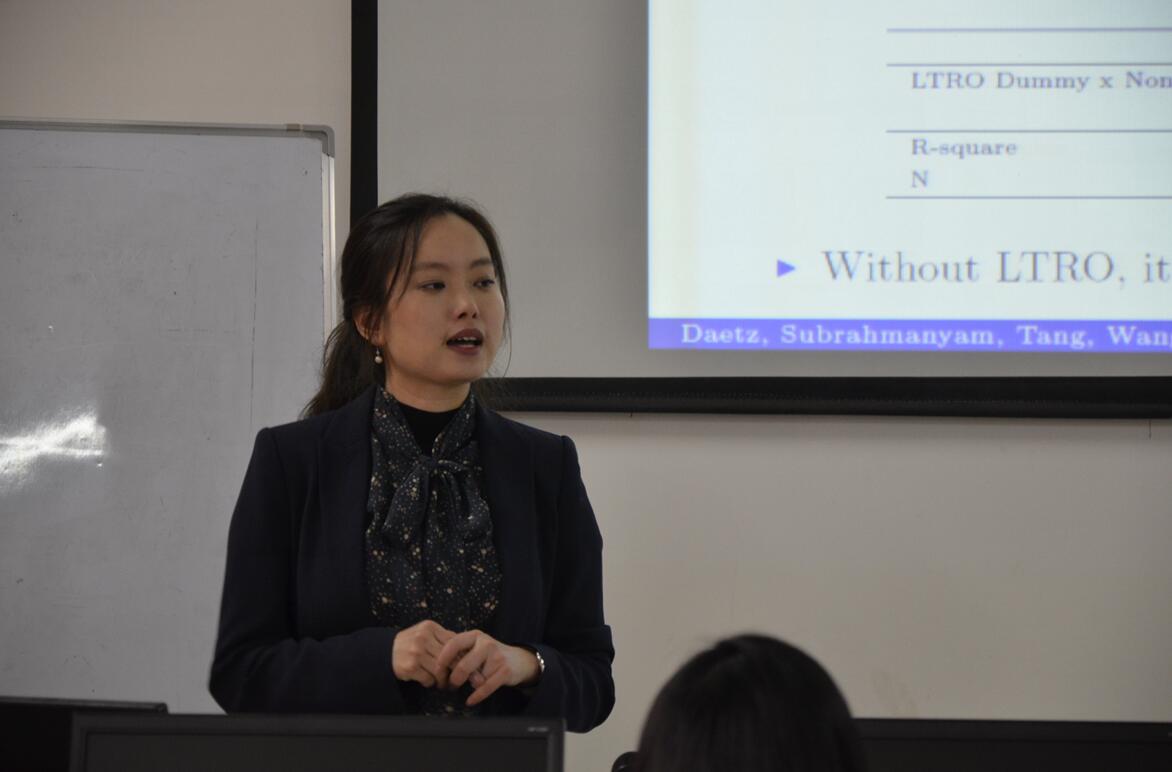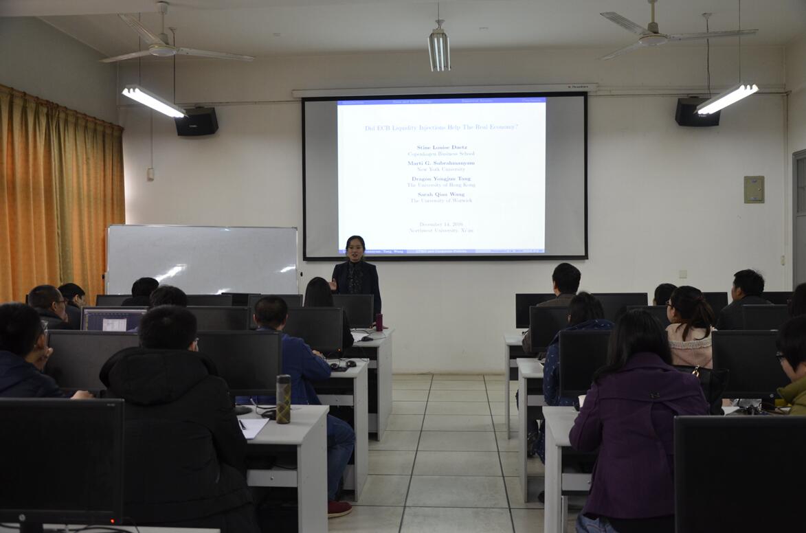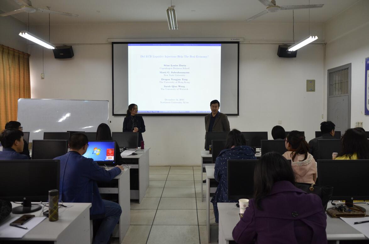 经济类教师学术沙龙2016年第4期(总第82期)于2016年12月14日下午在冰球突破豪华版官方网站长安校区8110教室举行。任教于英国华威大学的王倩博士应邀以《欧洲央行的流动性注入如何影响实体经济》为题,向参加活动的学院师生作了报告。本次沙龙由金融系副主任王峰虎副教授主持,金融系俞颖副教授点评,多名青年教师及冰球官网部分硕士研究生参加了本次沙龙。