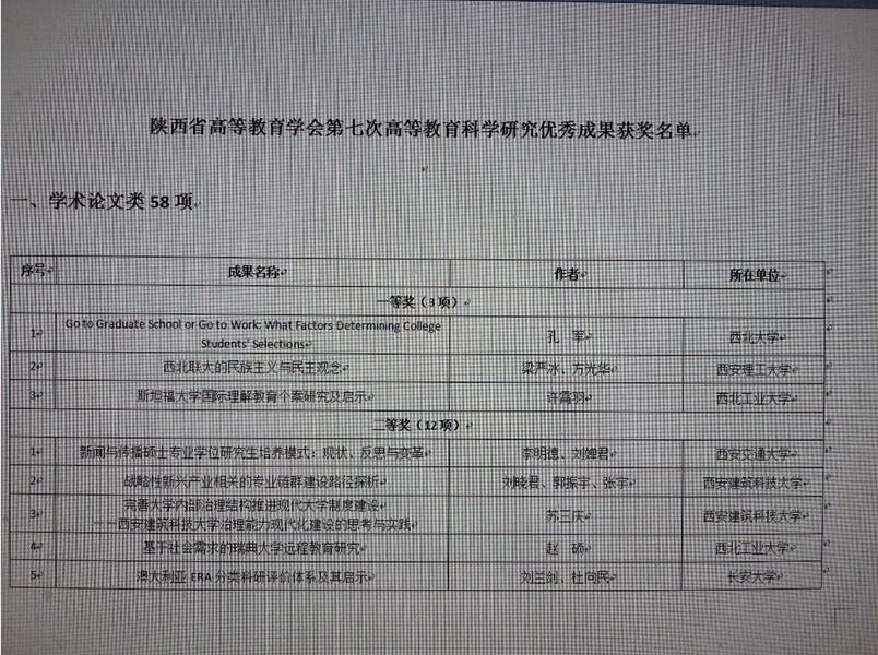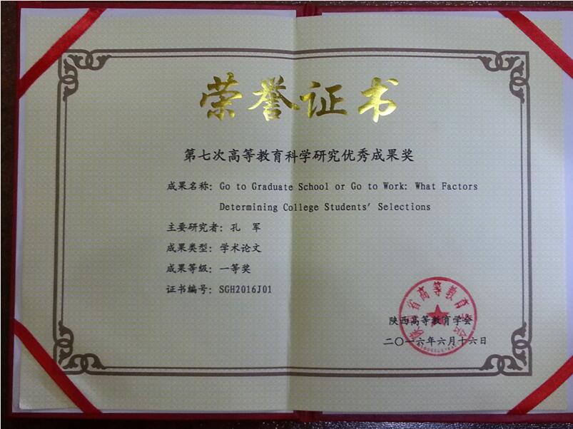 冰球官网孔军副教授的论文《Go to Graduate School or Go to Work: What Factors Determining College Students’Selections?》获得陕西省第七次高等教育科学研究优秀成果奖一等奖,在12月3日举行的陕西省高等教育学会年会暨校长论坛上受到表彰。这篇文章在SSCI检索期刊The Anthropologist上发表(2015, Vol.19(3), pp.773-780)。