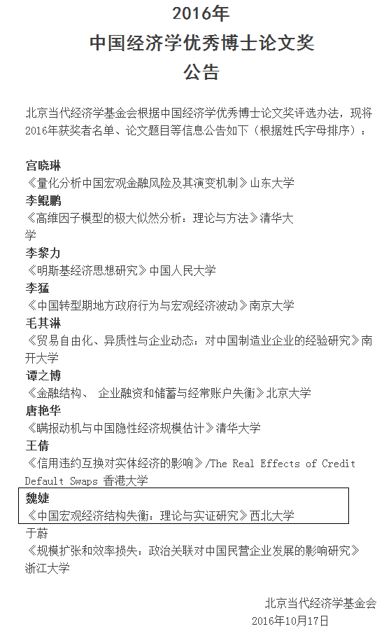 10月17日首届“中国经济学优秀博士论文奖”在京公布,冰球官网教师魏婕在其导师任保平教授指导下撰写的博士论文《中国宏观经济结构失衡:理论与实证研究》获此殊荣。