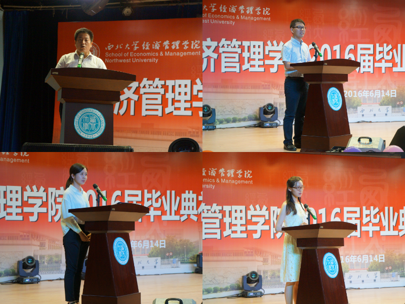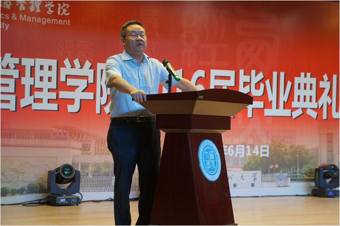 院长任保平教授发表了热情洋溢的讲话,向2016届全体毕业生表示热烈的祝贺和诚挚的祝福,并和同学们一起回忆了美好的大学生活。任院长深情寄语全体毕业生,希望大家在未来的人生道路上,注重提升自己的器量与见识,提高自己的内在修养和精神境界,锤炼自己的品格,先道而后术;既要坚持自己的理想,也要勇于从基层做起,做好吃苦耐劳的准备;保持终身学习的理念和习惯;面对困难时,能够顶得住压力,经得住痛苦,耐的住寂寞,受得了委屈,放得下过去;志存高远,饮水思源,牢记自己是西大经管人。任院长饱含深情的讲话引起了全体毕业生的广泛共鸣,他们以热烈的掌声向关心和培养他们的学院教职工表达了最诚挚的谢意。