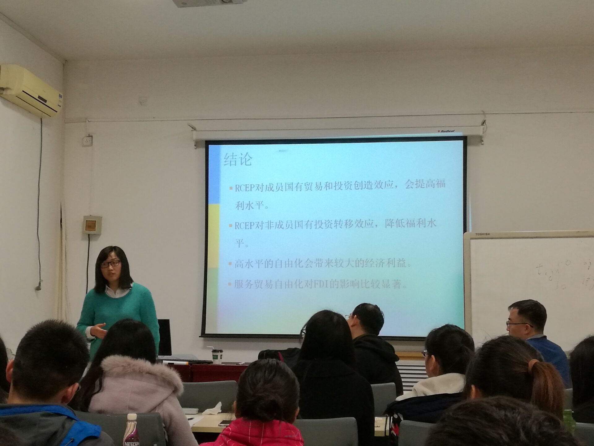 2016年3月23日晚,由经济学系和数理经济与统计系主办的现代经济学理论方法与创新论坛第十一卷第十一期在8202教室顺利举行。此次论坛主题为“Analyzing Effects of RCEP on FDI in a Firm Heterogeneity CGE Framework”,论坛由经济学系主任高煜教授主持,刘瑞明副教授担任评论人,世界经济与贸易系李侨敏博士担任主讲人,冰球突破豪华版官方网站青年教师、本科生和研究生30余人参加了此次论坛。