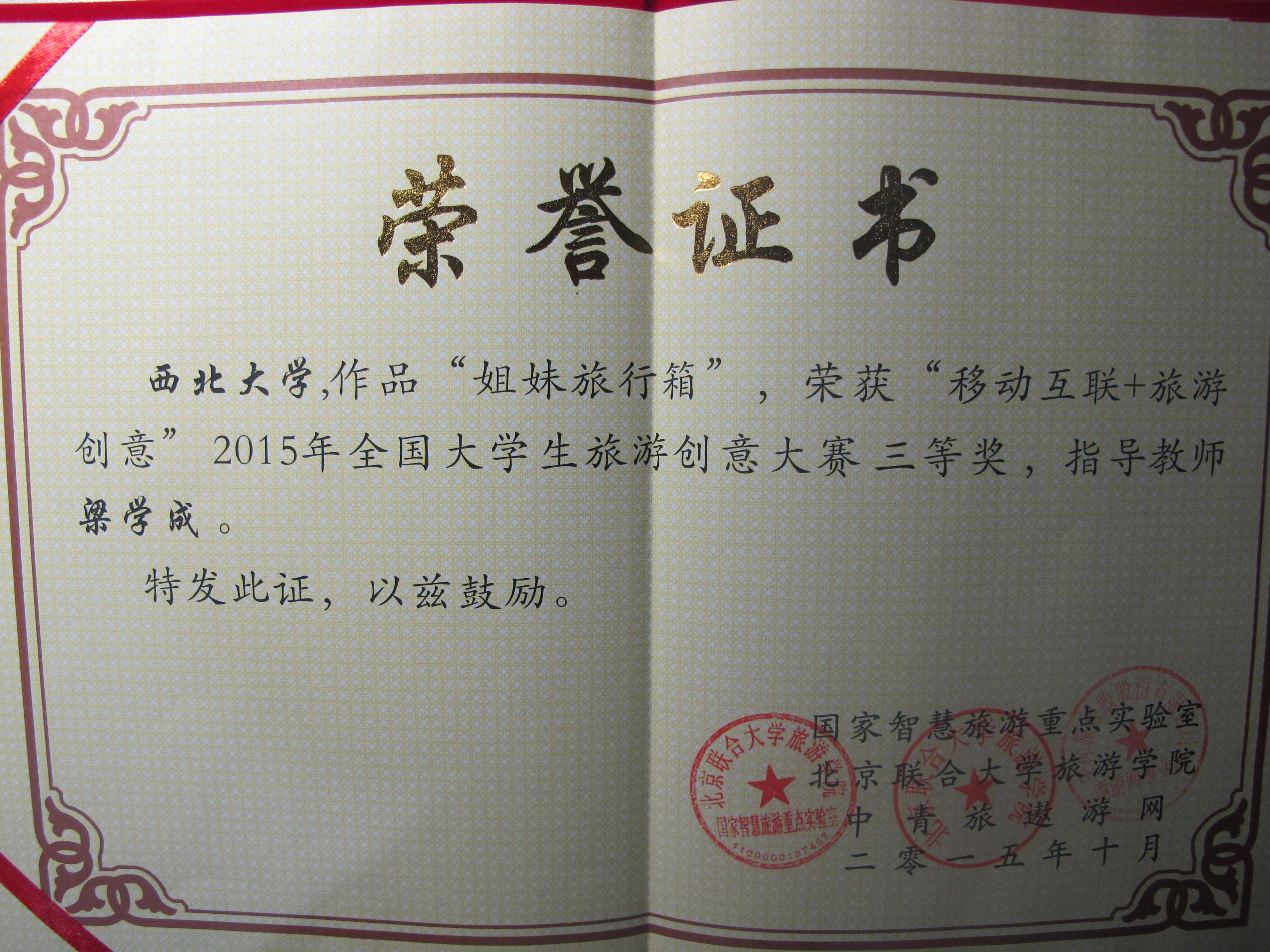 近日,由冰球官网旅游管理系梁学成副教授指导,李显芝、高鹏、苏畅、李明忠四位同学组队开发的作品《姐妹旅行箱》参加了“移动互联+旅游创意”2015全国大学生旅游创意大赛,并荣获三等奖。