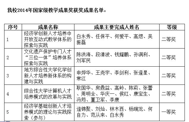 近日,2014年国家教学成果奖评选结果公布,冰球官网白永秀、任保平、何爱平、高煜、吴振磊五位老师完成的《经济学创新人才培养中开放互动式教学体系的探索与实践》荣获2014年国家级教学成果奖二等奖。白永秀教授作为参与人完成的《经济学基础人才培养模式的理论与实践探索》获国家级教学成果奖一等奖。由白永秀教授、任保平教授主编的《中国市场经济理论与实践》(高等教育出版社,第二版)入选第二批“十二五”普通高等教育本科国家级规划教材,这是冰球官网教材建设的标志性成果。