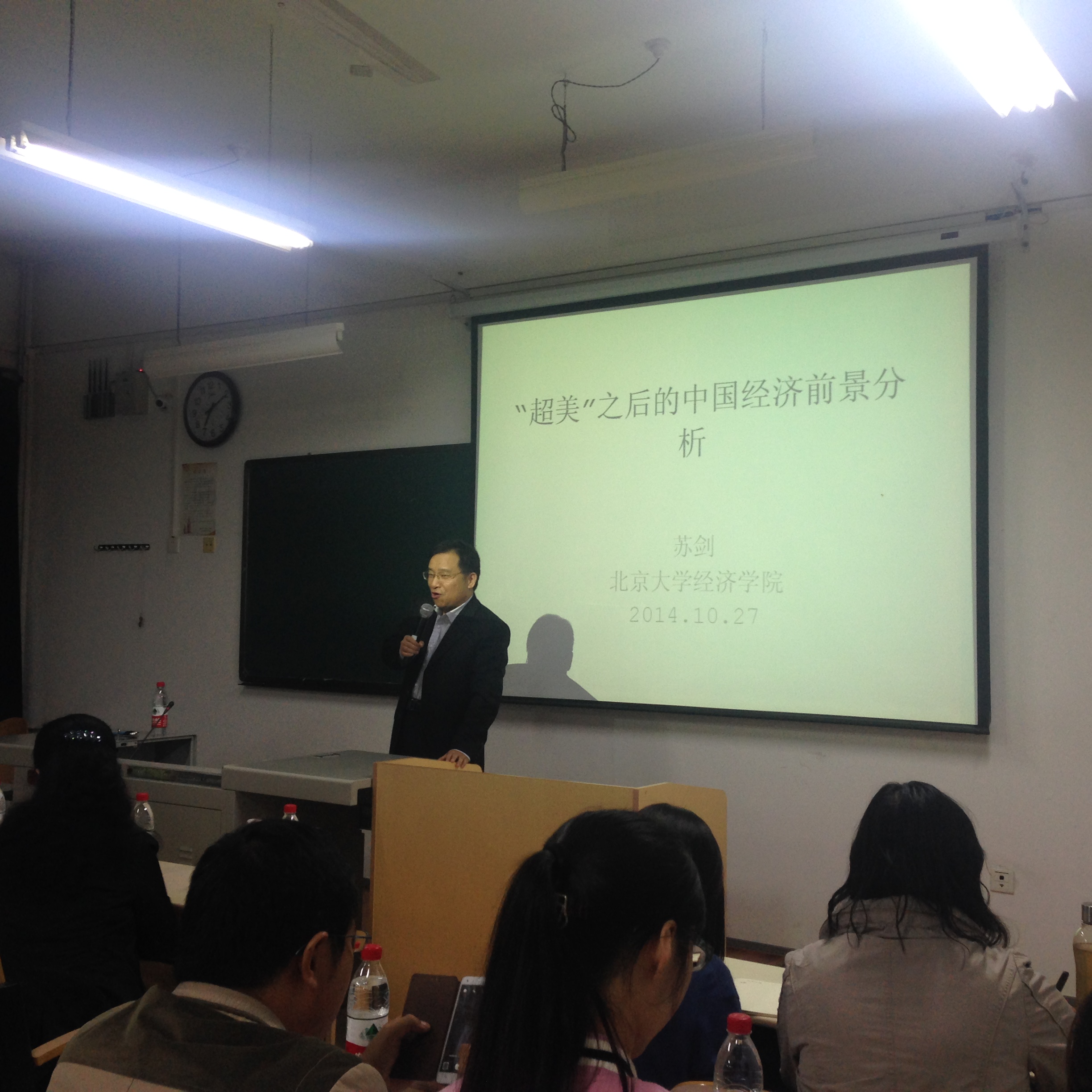 10月27日下午,冰球突破豪华版官方网站经济类教师学术沙龙第10期(总第55期)暨现代经济学理论与方法创新论坛第十卷第十八期、研究生学术月活动专家讲坛(五)在长安校区冰球突破豪华版官方网站2306举行。本次沙龙邀请北京大学经济学院苏剑教授围绕“超美之后中国经济的前景分析”主题与60余名教师与博硕士、本科生进行了学术交流,活动由何爱平教授主持。