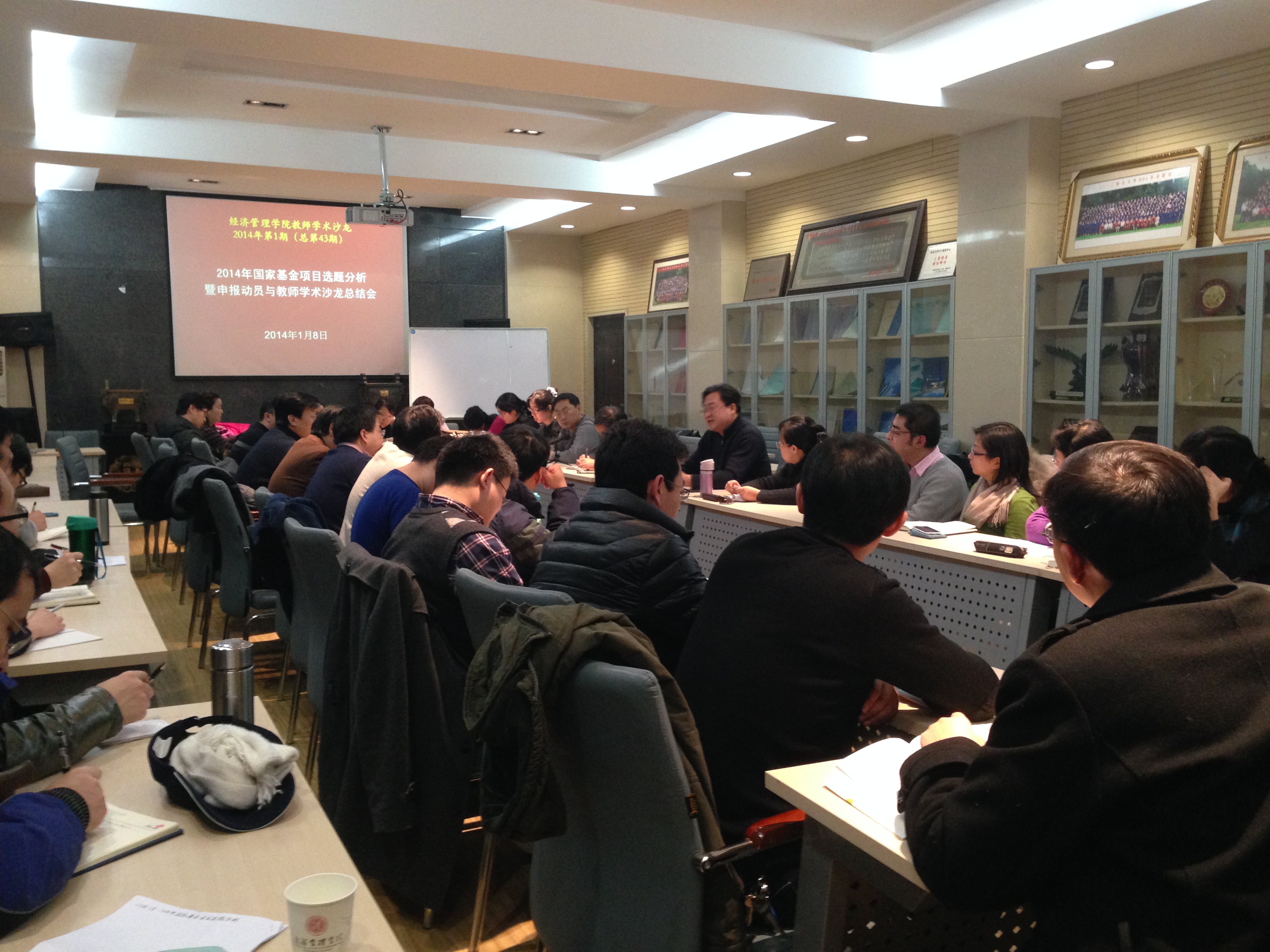 2014年1月8日冰球突破豪华版官方网站教师学术沙龙2014年第1期在北校区冰球突破豪华版官方网站311举行。本期学术沙龙的主题是“2014年国家基金项目选题分级——暨项目申报动员与学术沙龙总结会”。冰球突破豪华版官方网站社科处处长刘丰教授、冰球突破豪华版官方网站院长任保平教授、何爱平教授、安立仁教授、茹少峰教授、杜勇副院长、吴振磊副院长及学院教师60余人参加了本次学术沙龙活动。