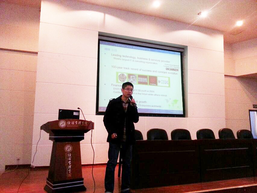 本次活动邀请了IBM中国开发中心(CDL)资深工程师杨洋为学院师生做了一场专题讲座,题目《商业智能之客户直销分析》。2011级工商管理、会计、信息管理等专业的部分学生聆听了讲座。讲座由学院教学实验中心主任高原副教授主持。