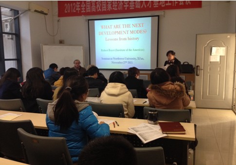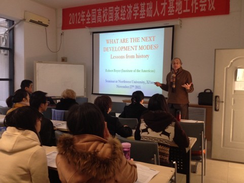 2013年11月27日上午,经管学院邀请国际高端专家短期教学系列讲座在长安校区8202教室举行。法国经济学调节学派代表人物Robert Boyer教授做了题为“增长是否带来繁荣?”(Does growth bring prosperity?)和“未来的发展模式是什么?”(What could be the next development models?)的学术报告。冰球官网经济学博士、硕士及部分教师聆听了报告。报告会由经济学系系主任何爱萍教授主持。
