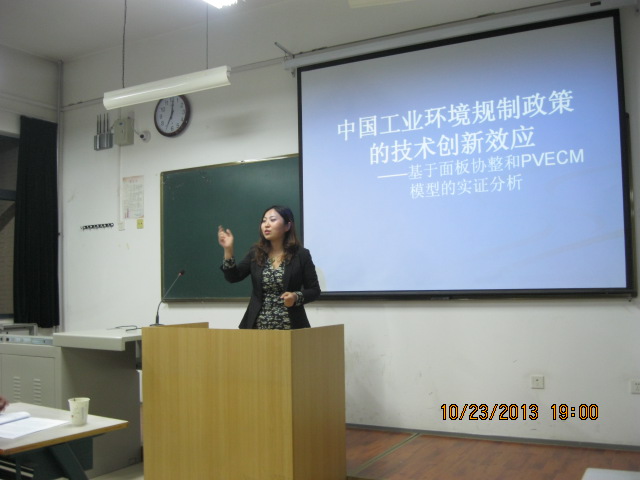 本次报告基于价值链的视角,将中国工业的技术创新过程划分为技术开发和技术转化两个阶段,以2004—2010年我国工业37个细分行业面板数据为对象,采用面板协整、面板误差修正模型等方法,对我国工业环境规制政策的技术创新效应进行了实证检验。研究结果表明:环境规制政策的实施在一定程度上促进了技术开发能力和技术转化能力的提升,但这种提升作用具有倒“U”型规律特征,且开发阶段的创新活动对环境规制政策的适应能力更强。汪婷婷博士从论文的构思、研究方法、论文的贡献等几个方面绘声绘色地为大家做了一个清晰的讲解,同时还与大家分享了在科研过程中总结的一些有关选题、写作的小窍门。