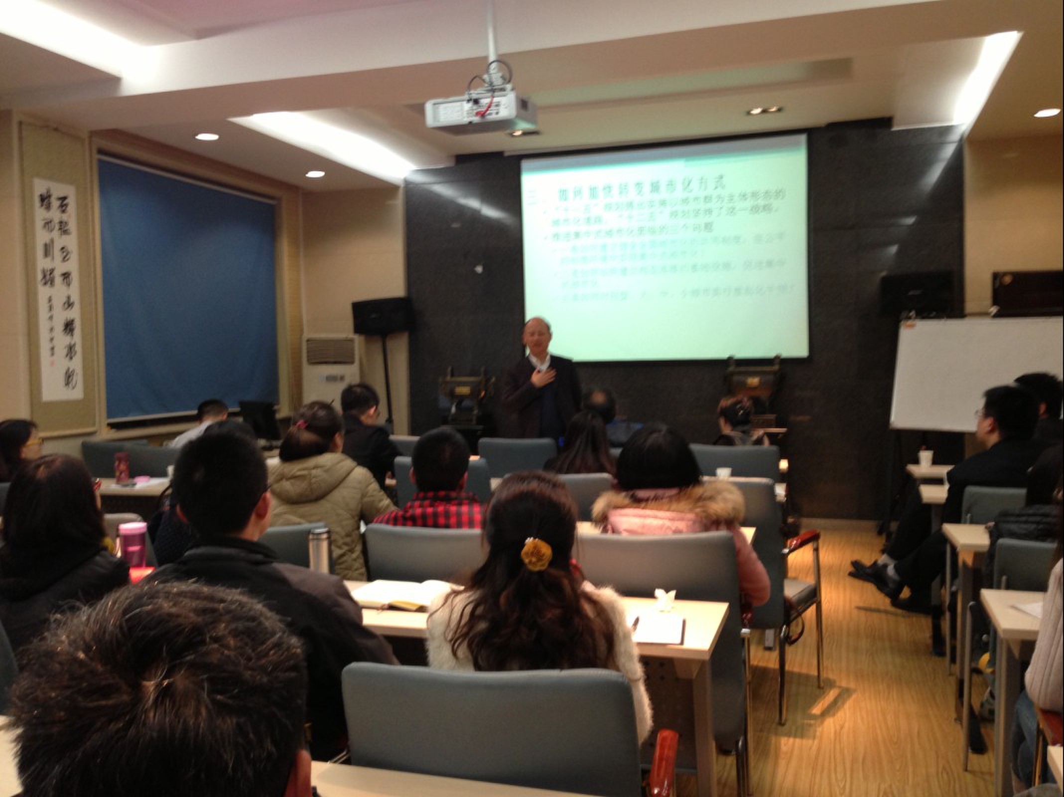 杨开忠教授从:(1)中国城市化——经济发展引擎;(2)集中城市化抑或分散城市化;(3)城市化转型等三个方面对中国城市化发展历程及趋势展开系统论述。杨教授提出城市化的核心与内涵在于城市经济人口的密度不断提升,并从人口、土地、基础设施等维度解析了城市化的经济过程、社会过程与空间过程。在此基础上,杨教授分析了我国城市化发展趋势中的集中化力量和分散化力量,分析我国应推进集中式城市化。最后,杨教授从城市化的共同制度建设、互连的基础设施以及差别化干预视角分析了我国发展集中式城市面临的问题。何爱平教授对杨开忠教授精彩的报告做了点评,她指出杨教授从高层次的国家战略对我国城市化发展进行了解读,无论思想性还是理论性对于教师和学生理解中国城市化进程都具有非常强的启发性。