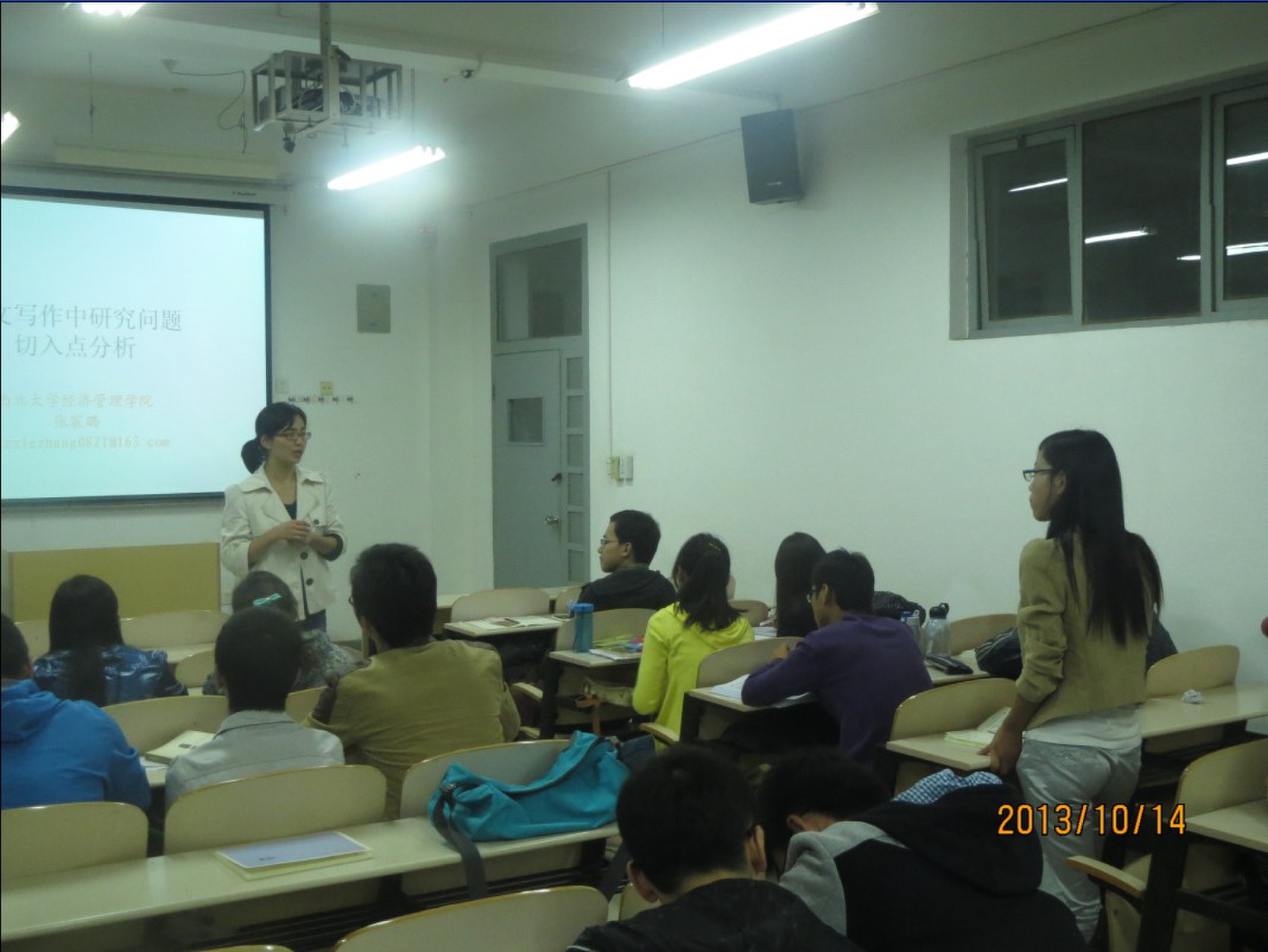 10月14日晚7点,冰球官网“经曰管云”系列学术论坛第二十讲暨第七届研究生学术活动月学术讲座第四场开讲在长安校区1210教室举行,此次报告诚挚邀请到了工商管理系讲师张宸璐老师给同学们做了了题为《论文写作中研究问题切入点分析》的专题报告。