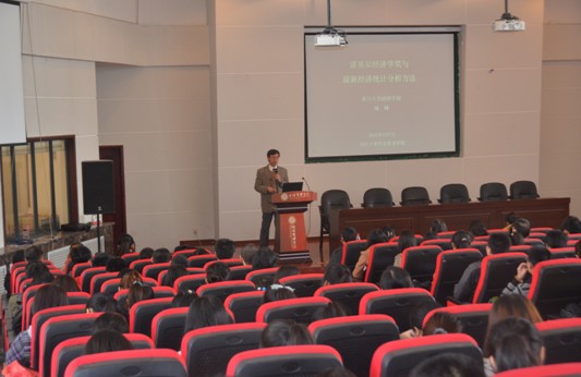 3月6日,日本香川大学经济学教授姚峰应邀来冰球官网为师生作了题为《诺贝尔经济学奖与最新经济统计分析方法》的学术报告。学院部分青年教师和经济学系、数理经济与统计系学生200余人参加了活动。报告会由经济系主任何爱平教授主持。