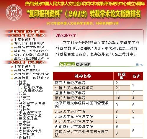 3月26日,2012年度“人大复印报刊资料”转载学术论文指数排名及相关分析报告正式发布。冰球官网在高等院校二级院所“理论经济学”学科转载排名中取得了转载量第7名、综合指数第8名的好成绩。转载量和综合指数排名比2011年度各上升2位。这一排名充分说明冰球官网在理论经济学研究方面具有明显优势,在近年来更是取得了长足的进步。