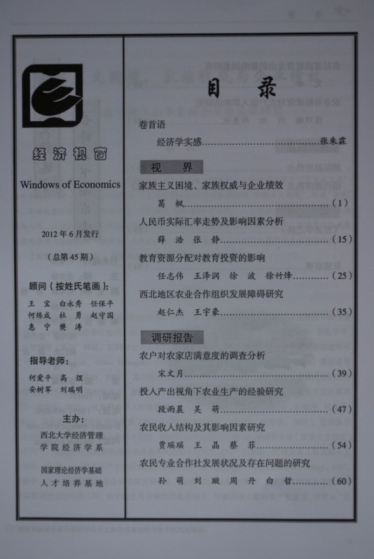 本期《经济视窗》共收录来自2009级、2010级、2011级各专业同学的文章和调研报告10篇。“视界”的4篇文章就家族企业治理、人民币汇率、教育资源分配与投资以及西北地区农业合作组织发展等问题进行了探索;6篇调研报告涉及农户对农家店满意度的调查、投入产出视角下农业生产的经验研究、农民收入结构及其影响因素、农民专业合作社发展状况及存在的问题、农村家庭教育支出的影响因素以及农业补贴政策对农户收入的影响。此外,本期继续有刊物的传统栏目“国际经济热点” 、“国内经济热点”和“读书”栏目。