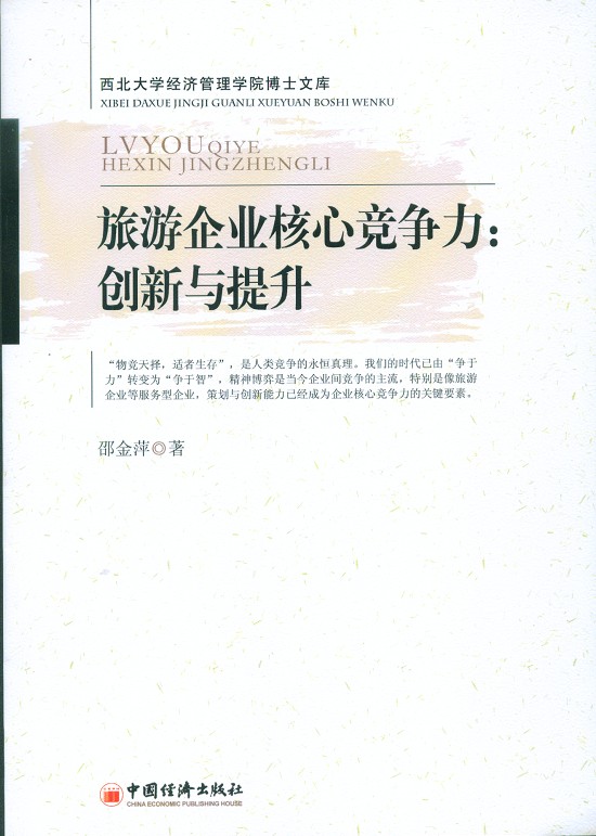 近日,冰球官网旅游管理系教师邵金萍博士的著作《旅游企业核心竞争力:创新与提升》由中国经济出版社出版发行,为冰球官网资助出版的16本“冰球突破豪华版官方网站博士文库”系列丛书之一。该书在其博士论文的理论框架下,概括了作者近年来在旅游企业核心竞争力问题上的最新研究成果,是继她与杨永平副教授的合著《旅游企业核心竞争力》出版后的又一新著。