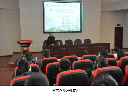 韦苇教授在报告中分四部分对国学思想进行了回顾,对传统文化的精华进行了深入地挖掘:一是阐述了中国传统文化的主流价值观念,指出儒家文化思想蕴含了爱国精神、报国情怀和富国理想,讲求个人对国家和民族的责任与奉献精神;二是引经据典,讲解了天人和谐观和禅宗的智慧;三是讲述了处理人际关系的“和谐”思想,提出社会“和谐论”和自我心理的“和谐论”;四是结合当下大学生心理现状,启发同学们汲取传统文化营养,树立正确人生观念,调整社会病态心理,为家庭和社会承担责任。韦苇教授还向在座的师生提出了舒缓压力的方法和建议,语重心长,言辞恳切,她的睿智、平和赢得了在场师生的钦佩与敬意。在报告结束时,她还同学们进行了热烈而深入的互动交流,她说:“教育工作者和心理学工作者承担着救助社会心理的责任,希望两界学者能从先贤那里借鉴智慧,以善为端,用善心相会,用善言善行相待,加之以精湛的医术或渊博的知识,开启心智,化解心结,救助青年学子和民众心理。”