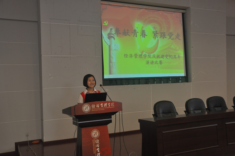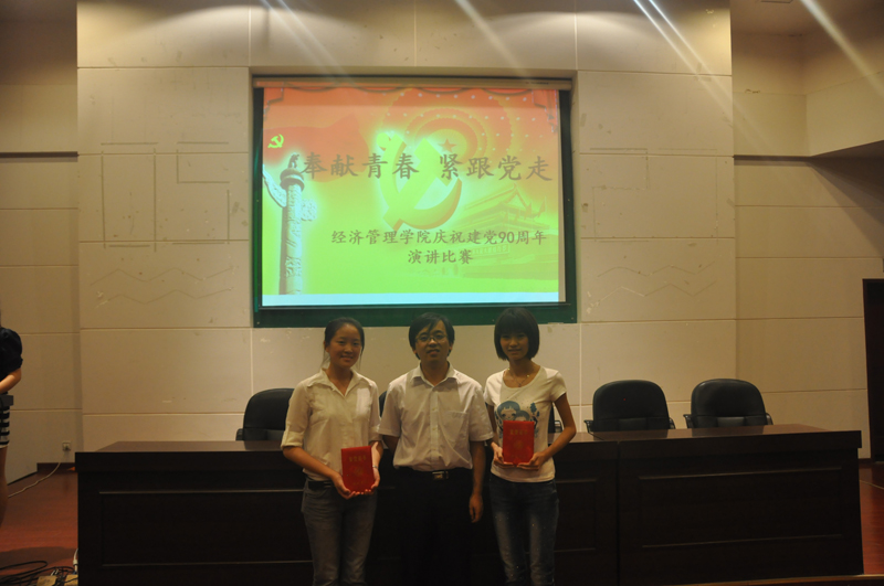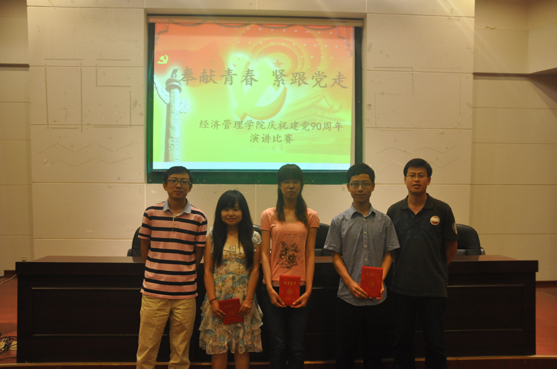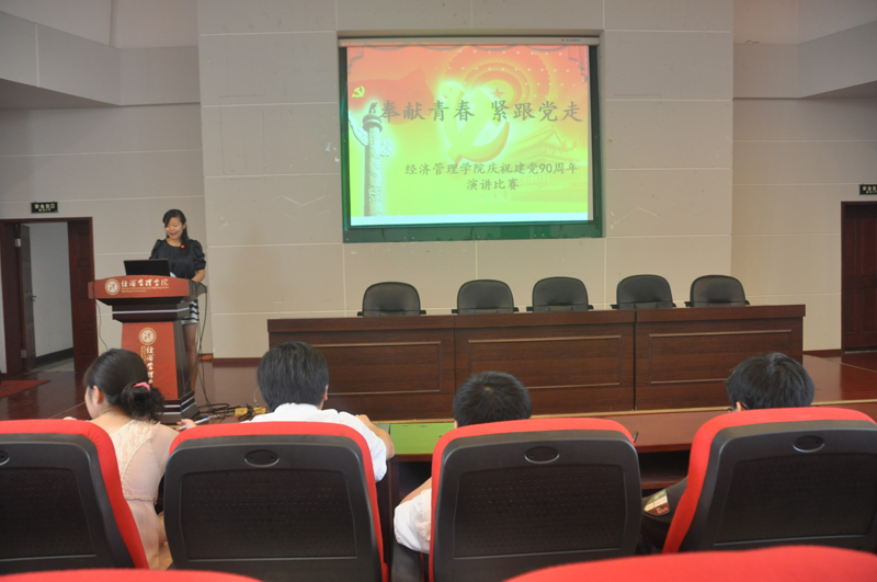 6月15日晚19点,学院在金海报告厅举办了以“奉献青春,紧跟党走”为主题的庆祝建党90周年演讲比赛,来自本科09级的10位同学参加了比赛,院团分委副书记史暐老师,及辅导员张洪杰,郝锐,李若昕,陈珂老师担任了本次比赛的评委,学生党员、入党积极分子和部分普通同学共计200余人观看了比赛。