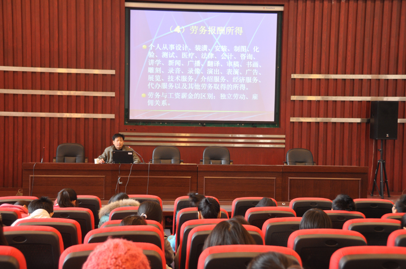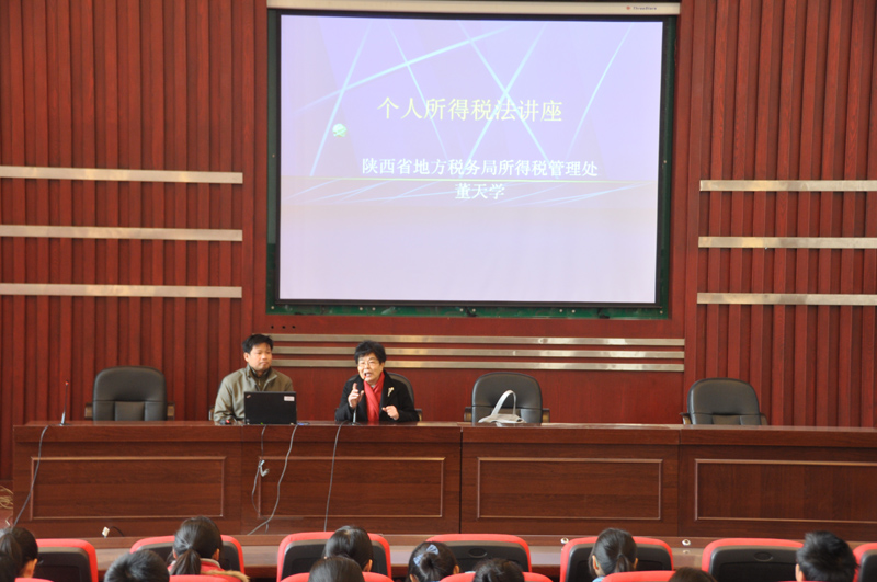 2010年12月15日下午2点,陕西省地税局所得税管理处董天学处长应邀在金海报告厅为冰球官网学生做了题为《个人所得税基本原理》的专题报告。报告会由冰球官网会计专业系主任张晓明教授主持,150余名会计系学生参加。