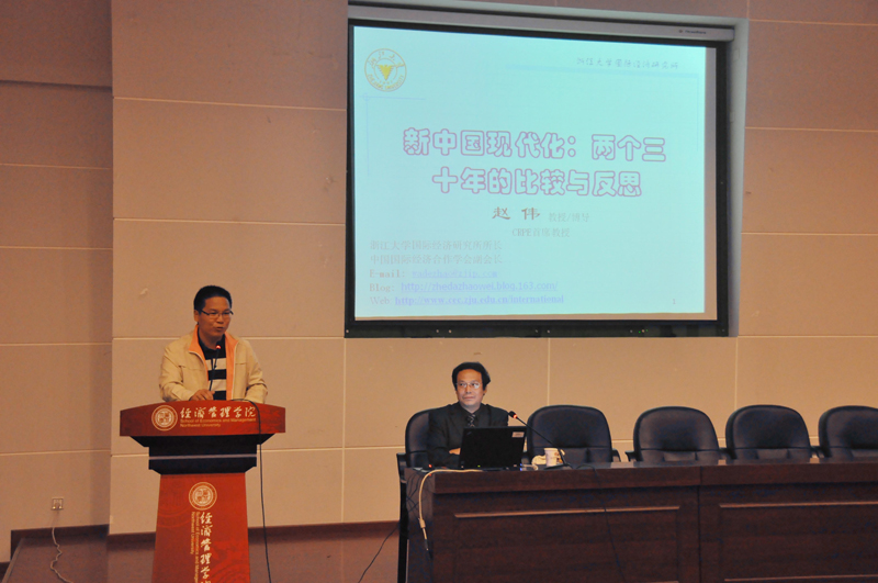 10月9日晚,冰球官网在南校区金海恒业报告厅举办了“第三届冰球突破豪华版官方网站研究生学术月活动系列讲座第一讲”,浙江大学国际经济研究所所长、博士生导师赵伟教授应邀为冰球官网学生作了题为《新中国现代化:两个三十年的比较与反思》的专题报告,报告会由副院长严汉平教授主持,学院300余名研究生参加了报告会。