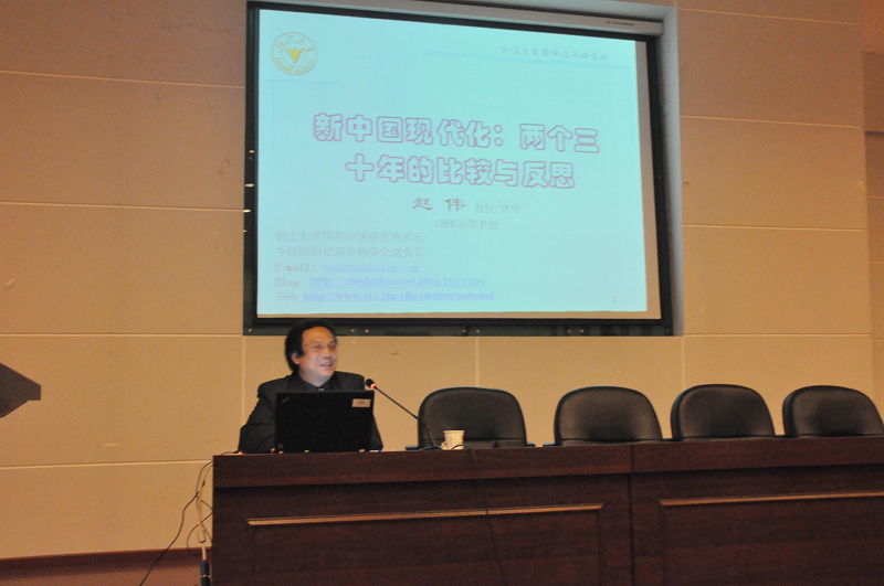 赵伟教授的报告分三部分展开。在报告的第一部分,赵伟教授介绍了“新中国两个三十年现代化进程的比较”,具体阐述了现代化的内涵、新中国两个三十年现代化进程的指标比较以及产生的成本。第二部分,赵伟教授阐述了“新中国两个三十年现代化进程的反思”,他认为现代化最基础的是经济发展,经济增长和产业体系优化是研究经济现代化的两个重要视点,中国两个三十年的现代化进程需要我们认真总结。第三部分,赵伟教授对中国的现代化进程做了展望,他认为中国现代化前景看好,具备持续发展的基础,但与此同时,中国现代化建设还需要不断深化改革。最后,赵伟教授回答了同学们关心的几个热点问题。