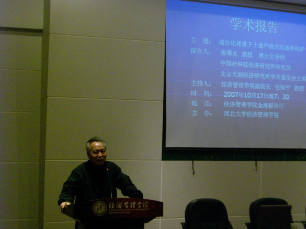 2007年10月17日晚7:30,中国社科院研究所研究员、北京天则经济研究所学术委员会主席张曙光教授来冰球官网作了一场“城市化背景下土地产权的实施和保护”的学术报告。报告在冰球突破豪华版官方网站长安校区金海报告厅举行,学院部分教师、研究生及经济学系的本科生200多人参加。