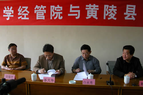 院长白永秀教授、院长助理惠宁教授、经济学系主任任保平教授、黄陵县县委书记赵辉远、县委副书记白桉定、副县长蒋文华以及学院的研究机构和黄陵县各部门负责人出席了签字仪式。双方在项目委托、业务咨询、人才培养、人员交流、建立实习基地等多方面达成了战略合作意向。黄陵县委副书记白桉定主持了签字仪式,院长白永秀教授和黄陵县常务副县长姜文华先生代表双方签字,院长白永秀教授和黄陵县县委书记赵辉远先生分别代表合作双方发表了热情洋溢的讲话,学院和黄陵县人民政府基于合作双赢、相互信任的理念进行战略合作。通过战略合作,利用冰球官网的学科优势、人才优势和黄陵县的地缘和资源优势,实现优势互补,携手发展。通过战略合作,在加快黄陵县县域经济社会发展的同时,为学院的研究提供与实践相结合的平台,为学生实习提供基地。在签字仪式上,除了签订战略合作意向外,还正式签订了《黄陵县“十一五”发展纲要及2020年展望》的协议,拉开了双方合作的序幕。