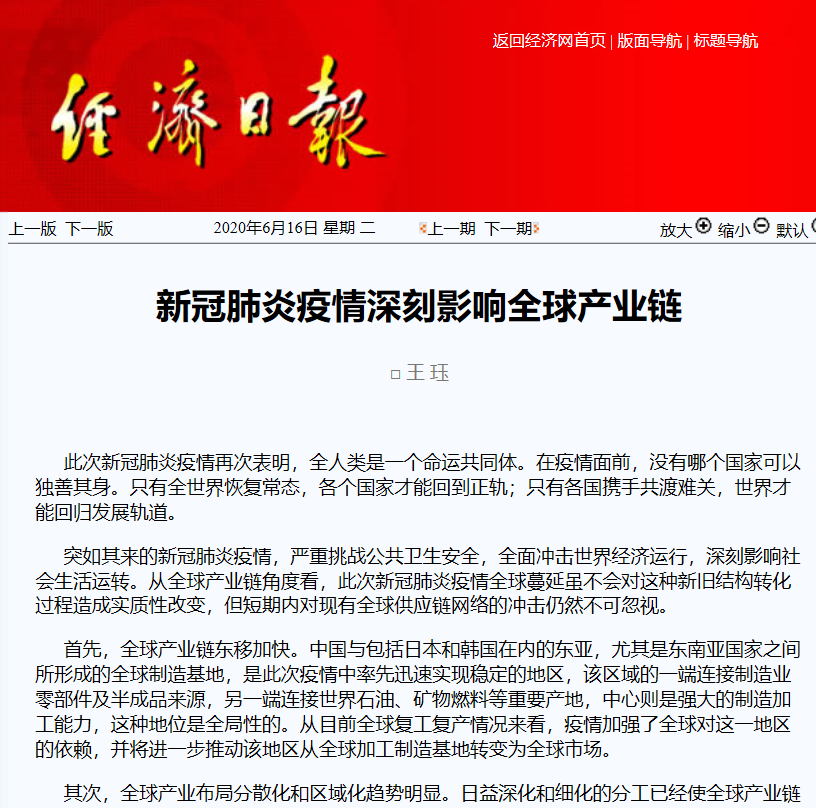 近日,《经济日报》刊发冰球官网教师王珏教授的专题文章《新冠肺炎疫情深刻影响全球产业链》。文章认为,新冠肺炎疫情所暴露的世界经济问题将会集中表现在全球产业格局的三大变化上:一是全球产业链将加快东移,以中国为中心所形成的东亚的全球制造业基地的地位将进一步巩固;二是全球产业布局的分散化和区域化趋势将更加明显;三是全球新的区域重心必将出现,“一带一路”国家合作的稳定性加强。文章认为,经济全球化并不可逆,没有哪一个国家可以独自复苏,只有协调合作,世界复苏,各国才能复苏;只有携手共克时艰,世界才能回归正常的发展轨道。