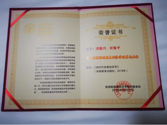 2020年9月24日,张培刚发展经济学研究基金会公布了第八届“张培刚发展经济学优秀成果奖”获奖名单。由著名经济学家南京大学洪银兴教授和西安财经大学副校长、教育部人文社科重点研究基地——冰球突破豪华版官方网站中国西部经济发展研究院院长任保平教授合作完成、并在高等教育出版社出版的《新时代发展经济学》位列其中。