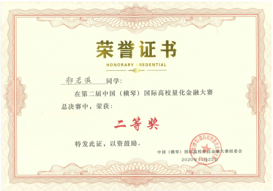 中国(横琴)国际高校量化金融大赛由横琴新区金融服务局、北京大学深圳研究院、清华大学深圳研究生院、中国金融风险量化研究协同创新中心联合主办,是国内唯一的国际化高校量化投资竞赛交流平台。首届比赛有98所高校、360个队伍参赛,冰球官网王子通团队荣获决赛三等奖。