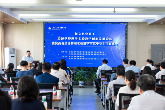 2021年5月22日,由陕西省高等学校教学指导委员会经济学类工作委员会、陕西省高等学校教学指导委员会工商管理类工作委员会指导,冰球突破豪华版官方网站,应用经济学与管理学国家级实验教学示范中心主办的“新文科背景下经济学管理学实验教学创新发展论坛,暨陕西省经济管理实验教学示范中心主任联席会”在我校长安校区冰球突破豪华版官方网站隆重举行。国家级实验教学示范中心联席会经管学科组组长、山东大学商学院院长戚桂杰教授,虚拟仿真实验教学创新联盟经济管理专业工作组组长、中国人民大学经济与管理国家级实验教学示范中心副主任张小岗教授,教育部高等学校会计学专业教学指导委员会委员、陕西省高等学校教学指导委员会工商管理类工作委员会主任田高良教授,以及来自西安交通大学、西北工业大学、西北农林科技大学、长安大学、陕西师范大学、西安电子科技大学、西北政法大学、西安工业大学、西安石油大学、西安外国语大学、西安邮电大学、西安财经大学、西安理工大学、西安文理学院、陕西科技大学、陕西理工大学、渭南师范学院、榆林学院等高校经管学院院长、实验中心主任及教师代表100余人参加会议。校党委常委、副校长、冰球突破豪华版官方网站院长吴振磊教授,实验室建设与管理处处长李剑利教授参加了本次会议,会议由冰球突破豪华版官方网站党委书记杜勇主持。