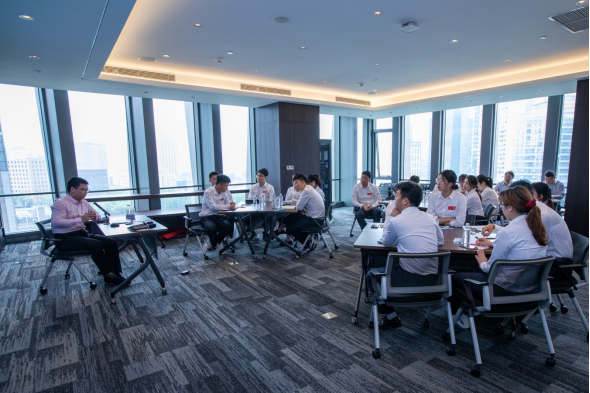 5月27日上午,参访团深入开源证券上海区域总部。开源证券总经理助理王博首先对学员提出两点期望,一是珍惜当下的学习机会,二是做好未来的规划,找到人生发展的目标与方向。开源证券总经理助理兼研究所所长孙金钜介绍了卖方分析师工作内容、研究所盈利模式以及开源证券研究所的发展现状。孙金钜还从财务知识储备、职场核心品质等方面给予了学员如何进入卖方研究所工作的相关建议。