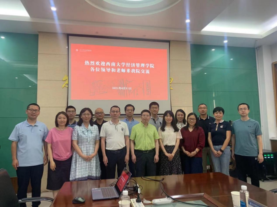 6月11日,西南大学冰球突破豪华版官方网站经济系系主任李海明教授一行11人来冰球官网交流座谈。冰球官网李辉副院长、经济学系吴丰华副教授、数理经济与统计学系副主任王莉副教授、工商管理系张洁副教授、会计学系韩少真副教授参加了座谈会。李辉副院长介绍了冰球官网的历史沿革、学科建设情况、专业建设情况、人才培养情况。与会双方就申报和建设一流专业、一流课程进行了深入交流。