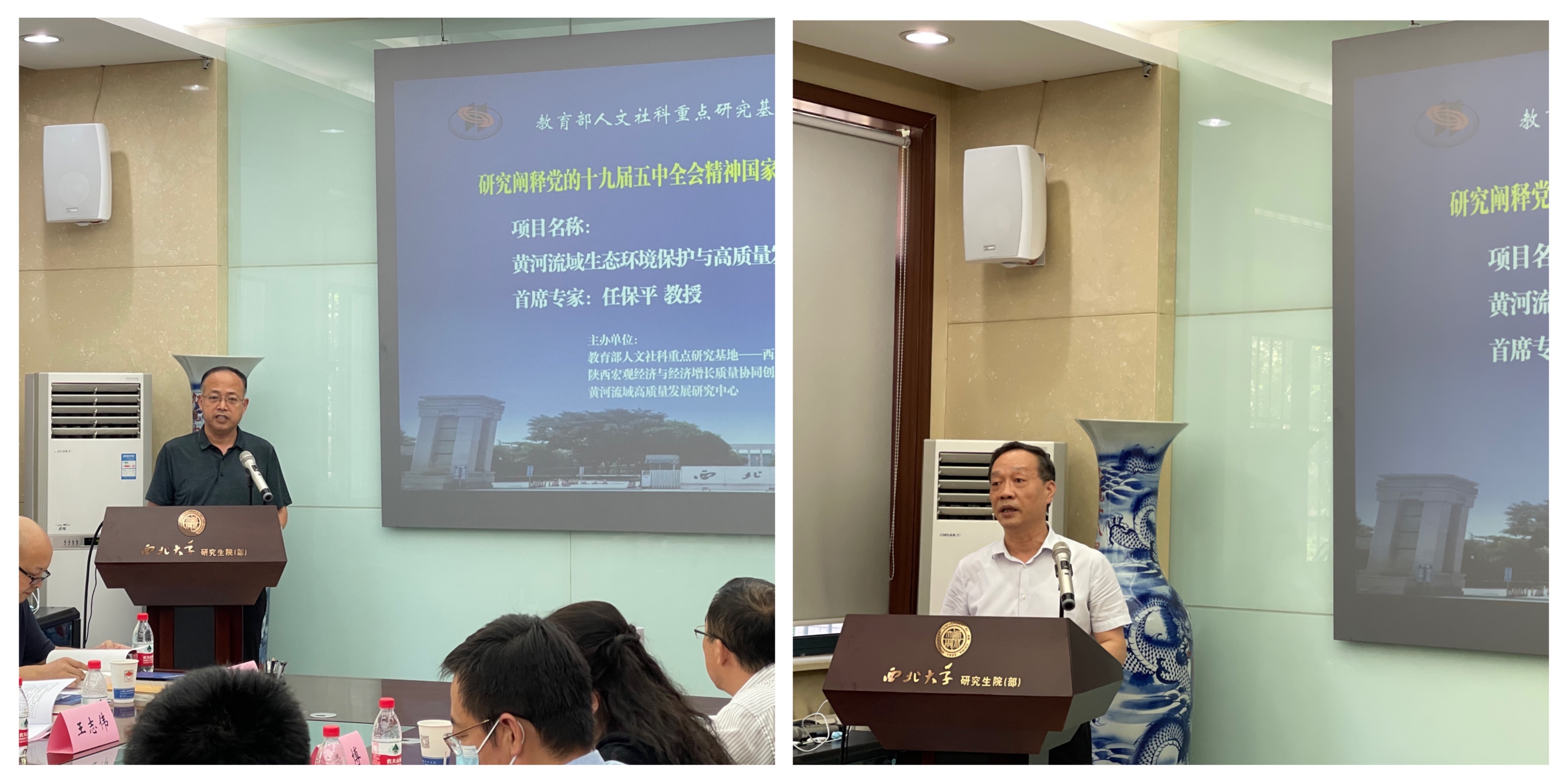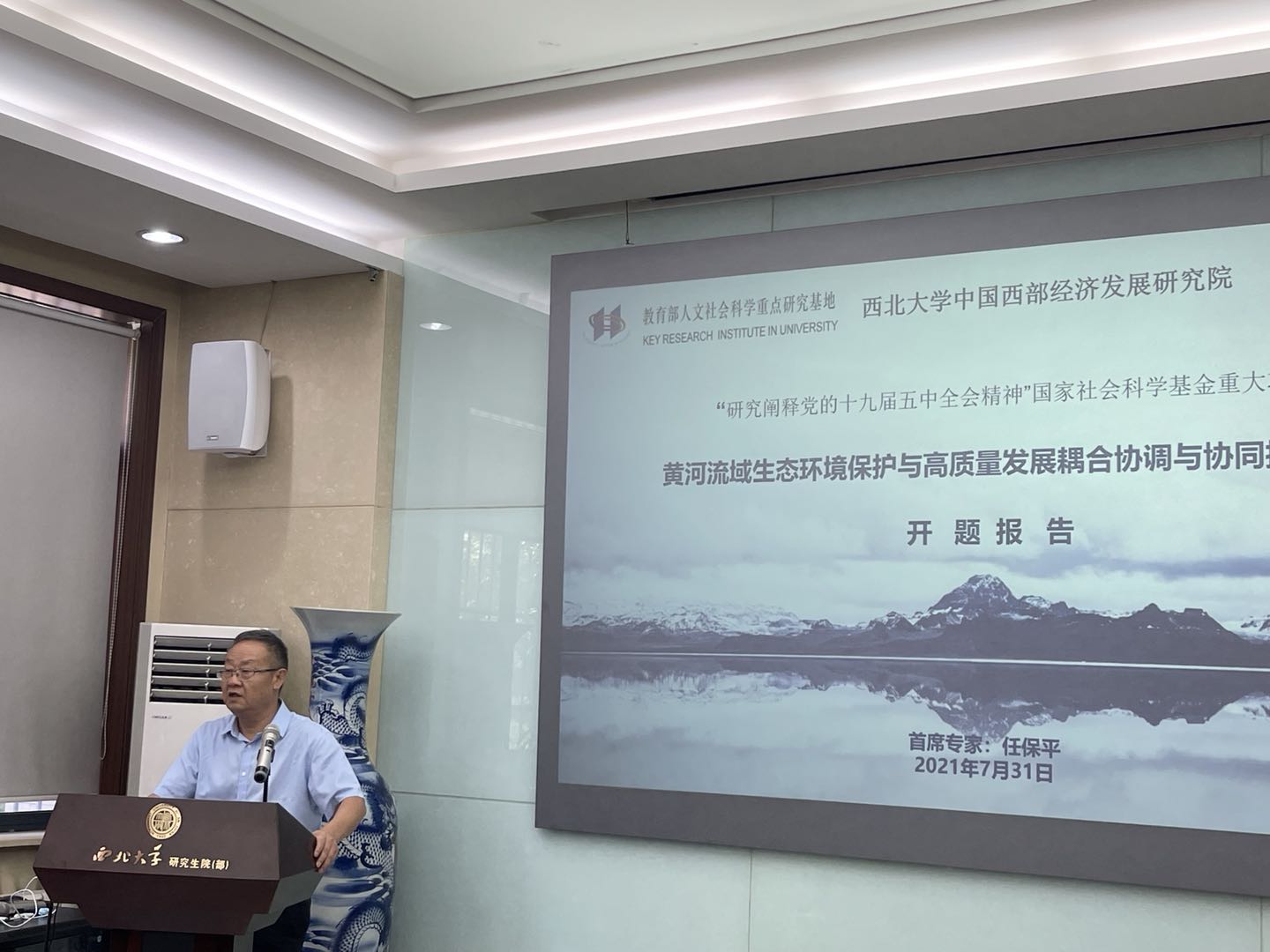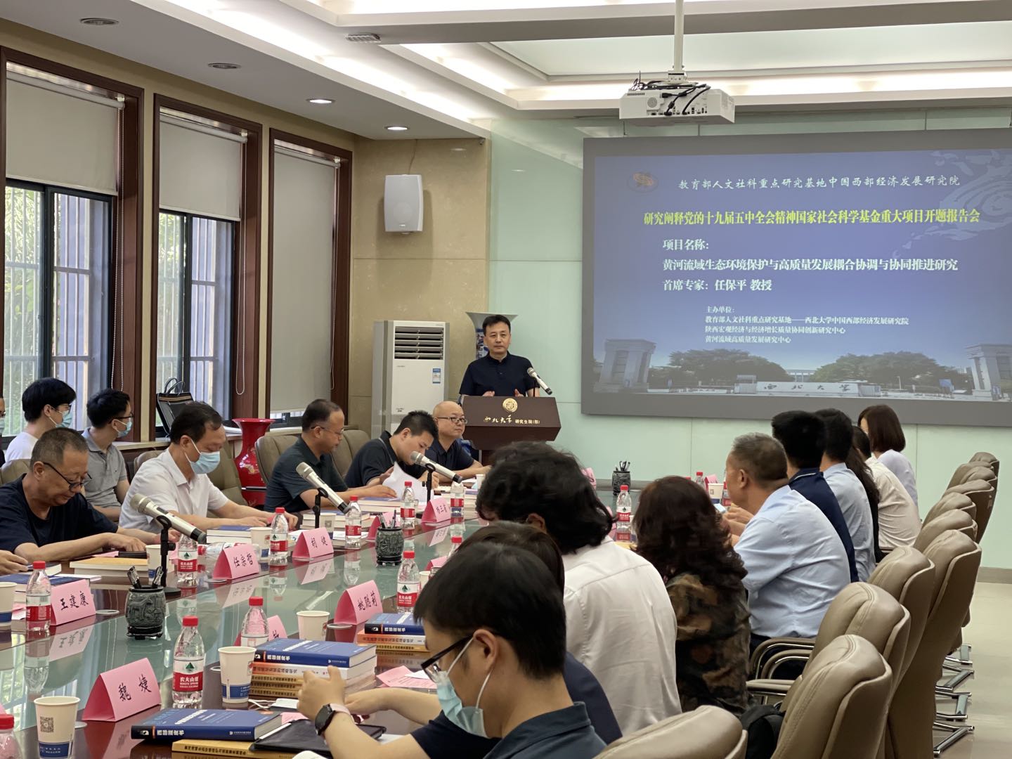 7月31日下午,由教育部人文社会科学重点研究基地——冰球突破豪华版官方网站中国西部经济发展研究院承担的国家社科基金重大项目《黄河流域生态环境保护与高质量发展耦合协调与协同推进研究》开题论证会在西安召开。陕西省社科联党组书记、常务副主席郭建树,陕西省委宣传部理论处处长、社科工作办主任高宝荣,陕西省委宣传部理论处国家社科基金重大项目主管王志伟、冰球突破豪华版官方网站副校长吴振磊和冰球突破豪华版官方网站社科处处长马朝琦、副处长李丰庆出席会议。西安财经大学原校长胡健教授担任开题论证会专家组组长主持论证环节,陕西省委副秘书长、省委党史研究室主任任宗哲教授,陕西省人民代表大会常务委员会财政经济工作委员会副主任杨三省教授,陕西省社科院副院长王建康研究员,陕西省发改委黄河办主任荣朝柱、冰球突破豪华版官方网站数理经济与统计学系主任茹少峰教授等担任专家组成员参加论证会。