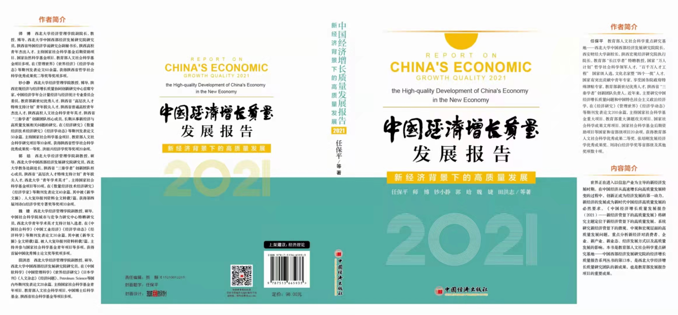 近日,由教育部人文社会科学重点研究基地—冰球突破豪华版官方网站中国西部经济发展研究院院长任保平教授及其团队成员师博教授、钞小静副教授、郭晗副教授、魏婕副教授、田洪志副教授等集体撰写的年度标志性成果——《中国经济增长质量报告(2021)》在中国经济出版社出版。全书由21章内容构成,共37.3万字。本书是研究院科研团队集体智慧的结晶,是新经济背景下对高质量发展研究的一次理论探索。