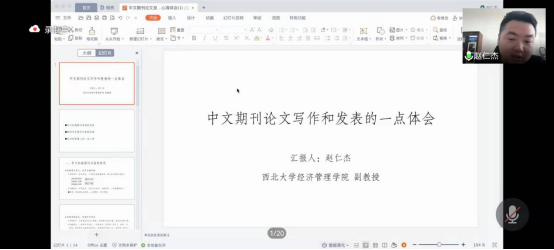 第三位分享者为赵仁杰副教授,赵老师从中文权威期刊目前情况、影响是否被送外审的因素以及应对投稿人的心得三个方面介绍了对于中文期刊的发表体会。首先,赵老师表示,权威期刊投稿量非常大,被拒稿是常态,要摆正心态,多写多投;审稿周期虽然较长,但是审稿期刊环节是规范的,作者可以根据不同审稿周期按需选择。其次,影响能否被送外审的一个关键因素为选题,作者可以通过期刊的选题指南了解前沿选题,其中,选题视角的独特性主要体现在关注的问题和解释视角的新颖性。最后,根据可能遇到的不同审稿意见,从审稿人和作者视角分别讲述了审稿人希望看到的修改结果和作者应该如何看待审稿意见。