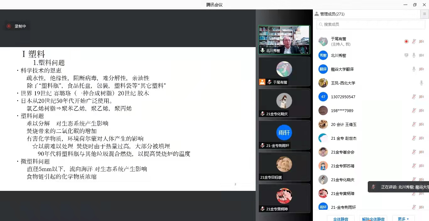讲座上,北川教授主要从塑料问题、国内外的动向以及采取的措施和改革方向三个方面分析了日本塑料垃圾政策。他通过介绍塑料、微塑料对生态和社会环境带来的一系列危害,引入了欧洲、中国和非洲各国在塑料垃圾处理问题上的应对措施,随后着重阐述了日本在这一方面的各项举措,其中包括循环型社会法律体系、日本家庭生产部分的塑料处理流程、2020年日本塑料垃圾处理情况、三种塑料回收利用的方式、塑料资源循环促进法等。讲座最后北川教授提出了对未来的研究课题以及政策改革方向的畅想。
