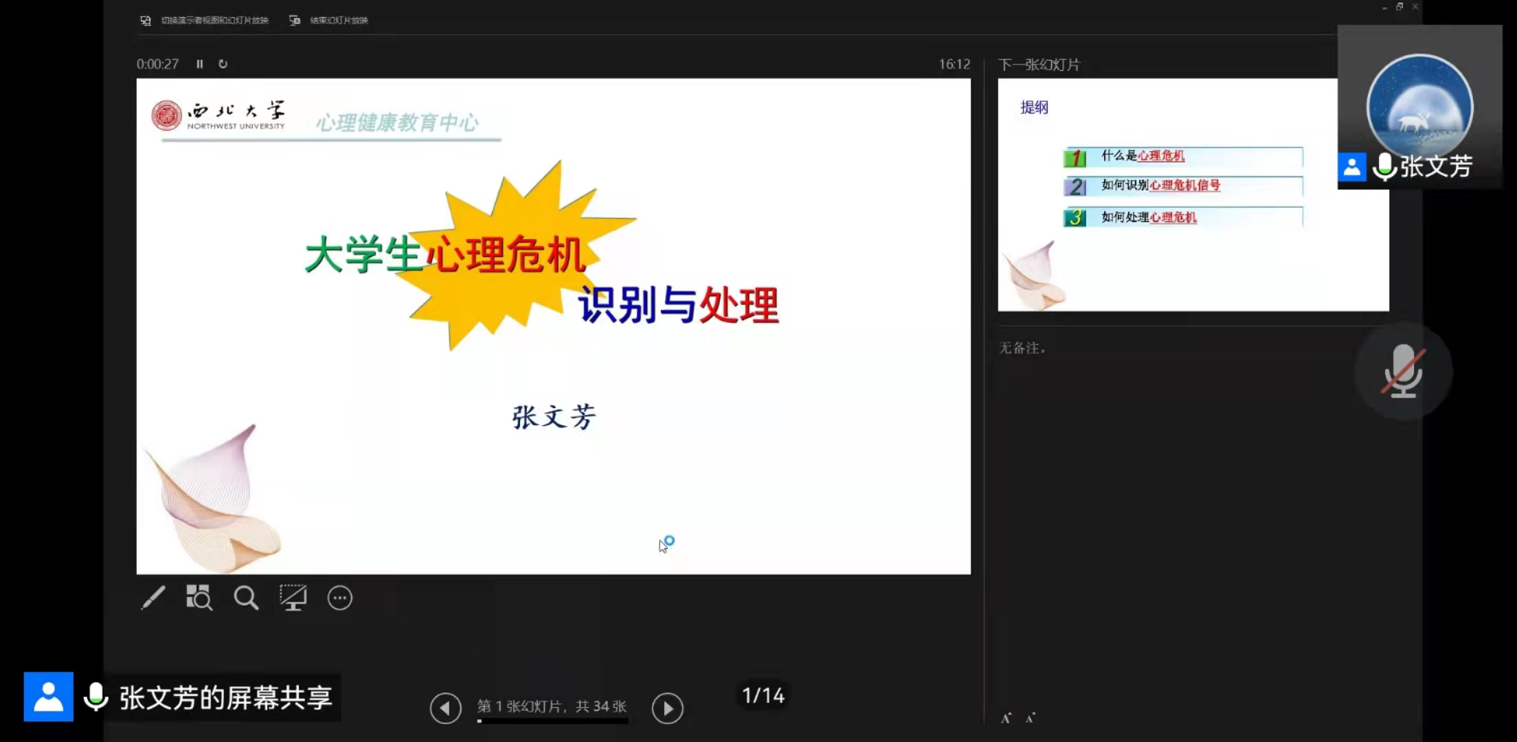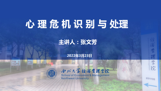 2022年3月23日下午4点,学院邀请冰球突破豪华版官方网站心理健康教育中心张文芳老师线上为心理委员、宿舍舍长、心理协会成员开展了题为“心理危机识别与处理”的心理讲座。讲座由学院心理专干、辅导员戴昶主持,参与讲座人数逾百人。