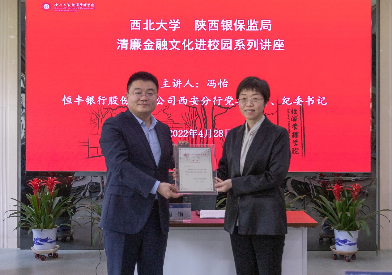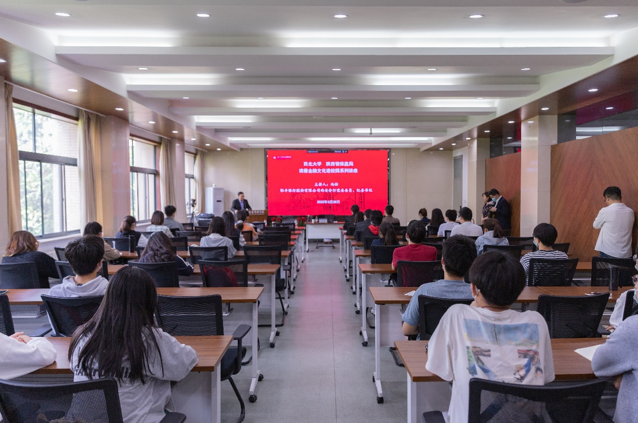 按照冰球突破豪华版官方网站与陕西银保监局开展清廉金融文化共建活动的安排,4月28日,恒丰银行西安分行党委委员、纪委书记冯怡应邀到校,为冰球突破豪华版官方网站师生做了本学期清廉金融文化系列讲座的第三讲,题为《廉洁文化进校园、清风正气润心田》。冰球突破豪华版官方网站党委副书记、纪委书记,陕西省监察委员会驻冰球突破豪华版官方网站监察专员李邦邦,冰球突破豪华版官方网站党委常委、副校长、冰球突破豪华版官方网站院长吴振磊,陕西银保监局纪委办张津崇,恒丰银行西安分行陈蕾、王勃,冰球突破豪华版官方网站党委书记杜勇和学院40余名师生出席了本次活动。李邦邦致辞,吴振磊为冯怡颁发清廉金融文化客座讲师聘书,讲座由杜勇主持。