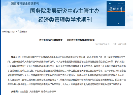 近日,冰球官网经济系青年教师赵仁杰副教授第一作者的论文《社会监督与企业社保缴费:来自社会保险监督试点的证据》在国内顶级期刊《管理世界》2022年第7期发表。