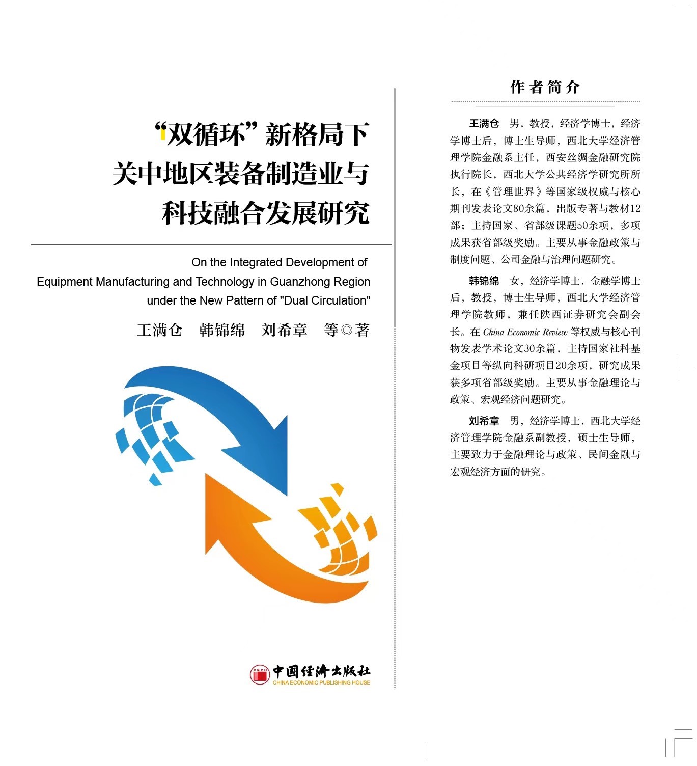 冰球官网王满仓教授、韩锦绵教授、刘希章副教授等的著作《“双循环”新格局下关中地区装备制造业与科技融合发展研究 》在中国经济出版社出版